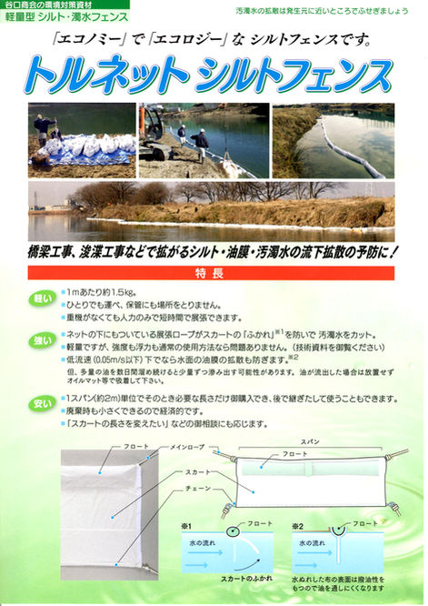「トルネットシルトフェンス」は橋梁工事、浚渫工事などで広がるシルト・油膜・汚濁水の下流拡散防止に!!